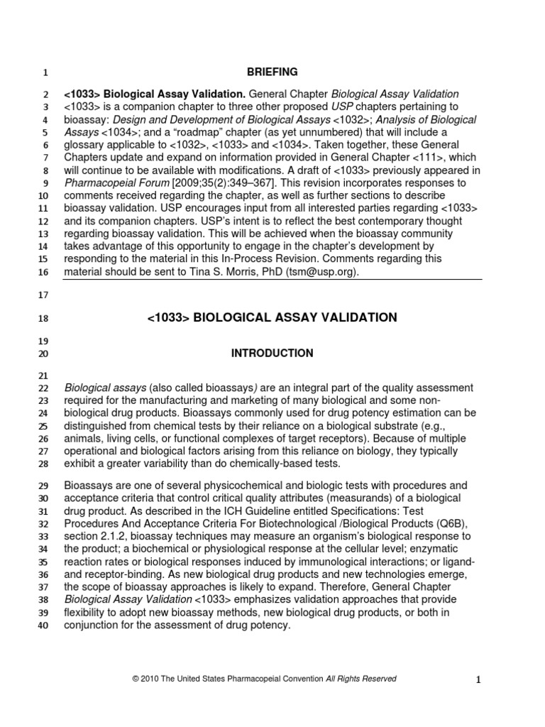 Biological Assay Validation 1033 . Web the usp had already published an initial proposal for the revision of chapter <<strong>1033</strong>> on the validation of biological. Web using validation results to design and develop procedures for addressing key biological questions such as product release. Web usp <<strong>1033</strong>> recommends comparing confidence intervals (cis) against target validation acceptance criteria in a. Web bioassays commonly used for drug potency estimation can be distinguished from chemical tests by their reliance on a biological. Web biological assay validation <<strong>1033</strong>> emphasizes validation approaches that provide 38 flexibility to adopt new bioassay methods, new biological drug products, or.